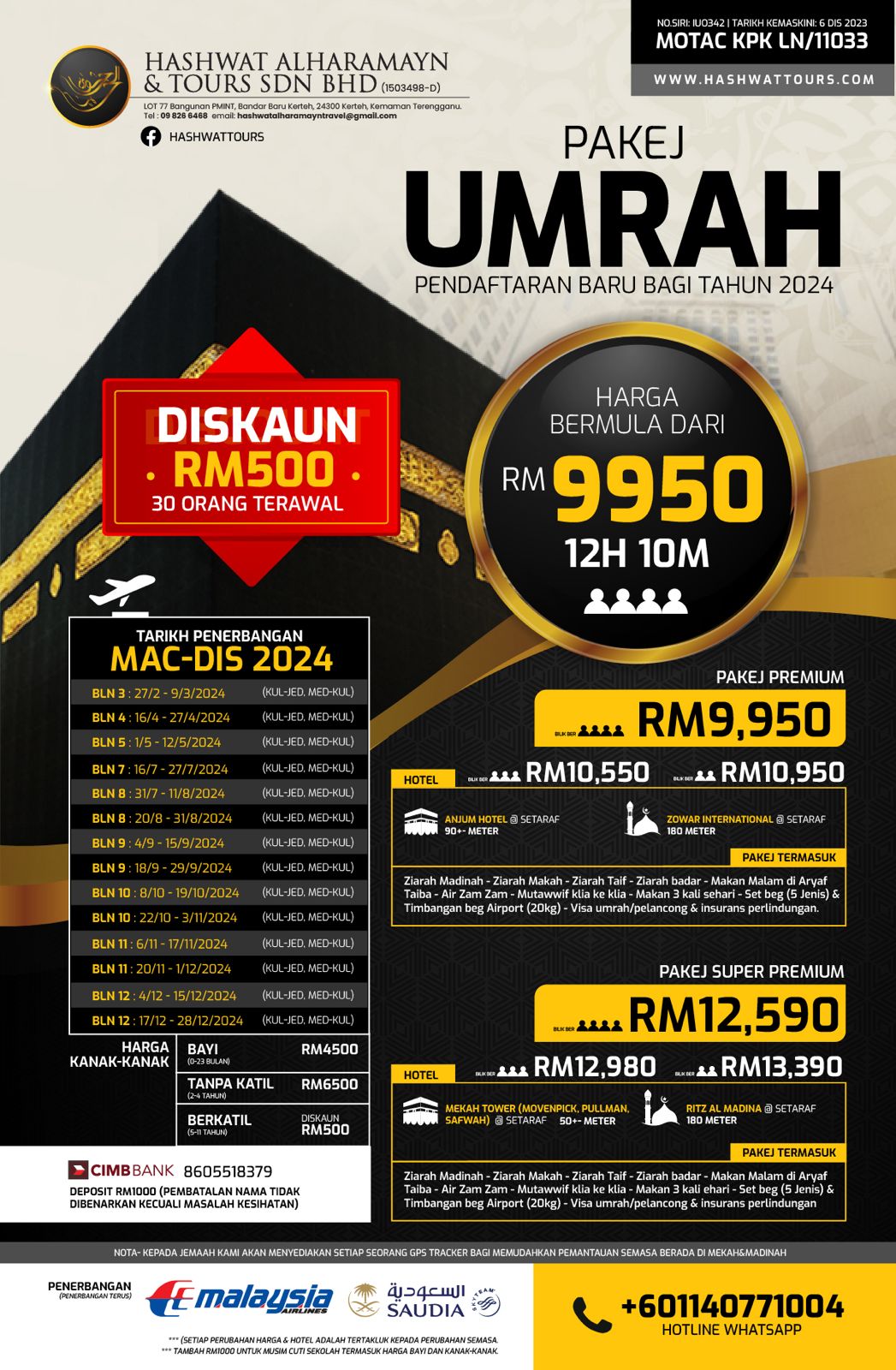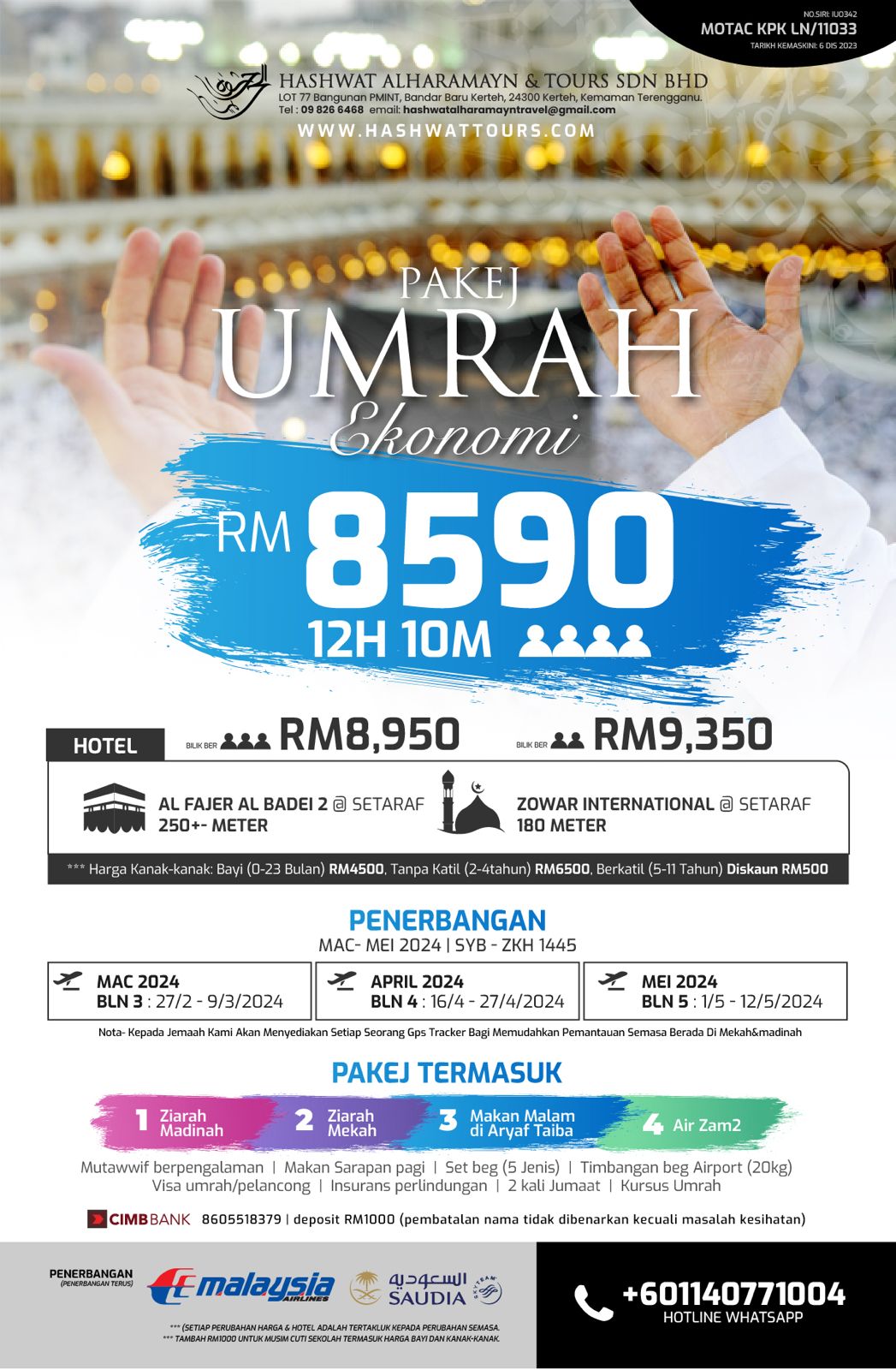 Kelebihan Pakej Hashwat Tours Kelebihan Pertama Mengambil keberkatan melaksanakan dua sesiSolat Jumaat semasa menjalani Umrah. Kelebihan Kedua Lokasi penginapan di kawasan utama yang berdekatan dengan Masjid al-Haram dan kemudahan umum. Kelebihan Ketiga Harga kami terjamin dari perubahan harga yang tidak dijangka. Kelebihan Keempat Mutawwif berpengetahuan tentang kawasan setempat dan berpengalaman dengan memastikan perjalanan Umrah berjalan dengan lancar. pakej hashwat tours Pakej Umrah Promo Pakej Haji Pakej Perlancongan Asia Pakej Perlancongan Eropah