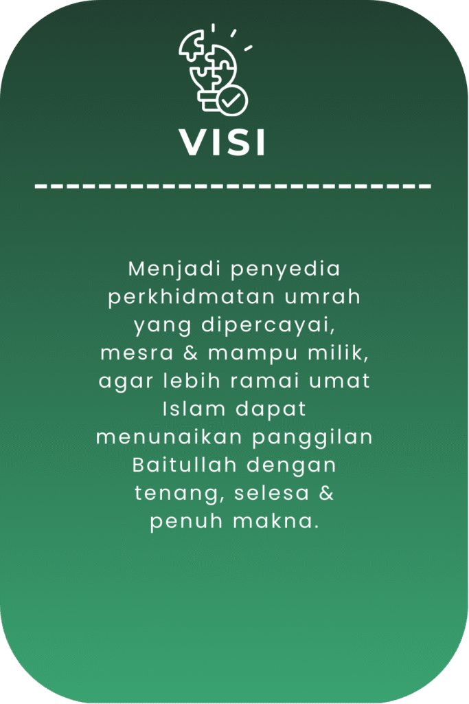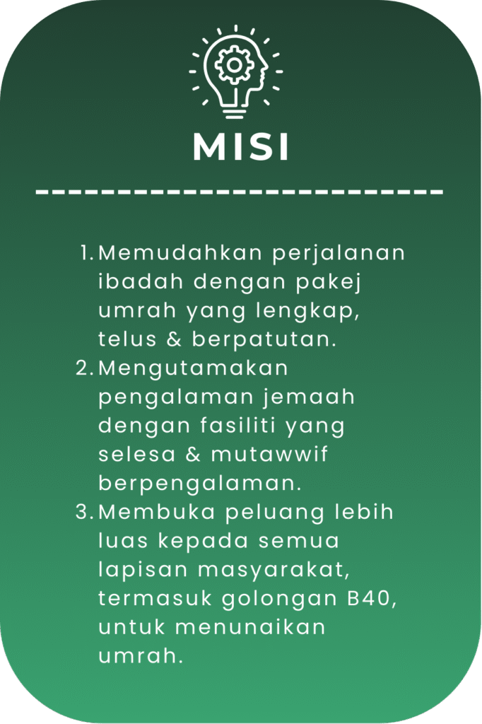 Komitmen kami adalah untuk menjadi teman perjalanan ibadah anda yang boleh dipercayai, agar Umrah anda bukan sekadar perjalanan, tetapi satu kenangan yang mendekatkan diri kepada Allah SWT.